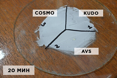 Для чистоты эксперимента Стиз А выдерживался в лабораторных условиях в течение шести суток. Толщина слоя составляла 0,5-1,0 мм. Время воздействия средств – 20 и 60 минут.